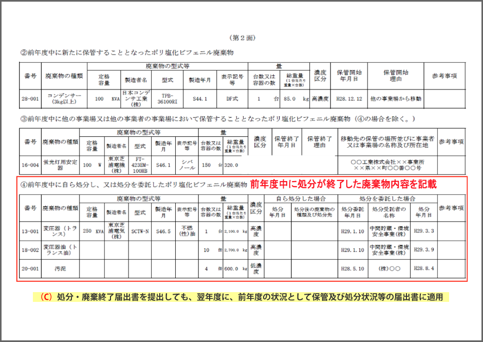 全ての高濃度PCB廃棄物を処分した場合、全ての低濃度PCB廃棄物を処分した場合、または、全ての高濃度PCB使用製品の廃棄(仕様を止め、廃棄物とすること)が終了した場合は(B)処分または廃棄終了後20日以内に届け出る必要があります。