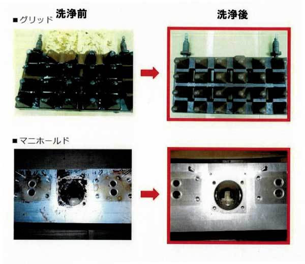 実施例 | 弊社工場にて、独自の洗浄剤を用いホットメルト塗布設備付着した汚れ・炭化物等を新品同様に洗浄します。 ノズル・フィルター等、細かい穴内部もリサイクル可能です。 |